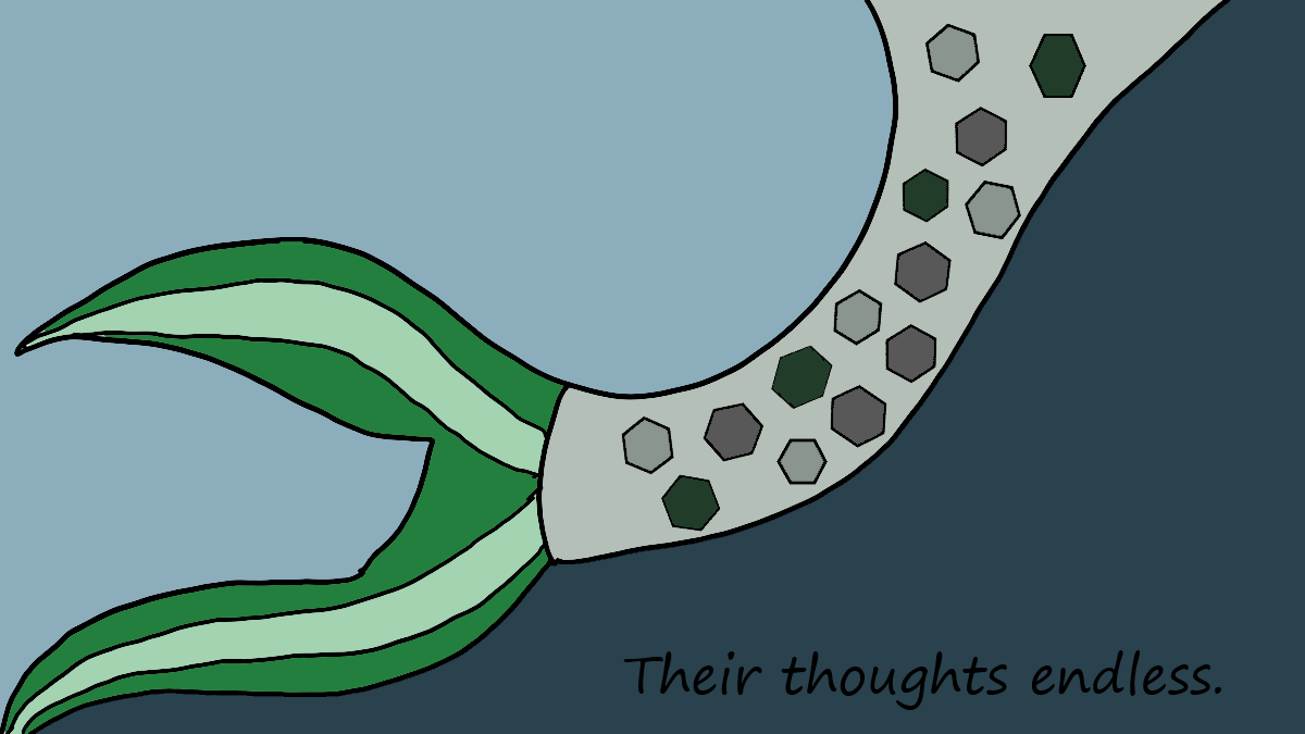 A green, greyish creaturecovered by scales all the way down to their tailthat once could have been legs.If they had evolved upon landrather than diving deeperdown the depths of the coldest of placesand deeper they went loosing fur facial features changing teeth pointedeye lids no longer neededgills to breath and a tail to swim.Echolocation becauseContinue reading “Their thoughts endless.”