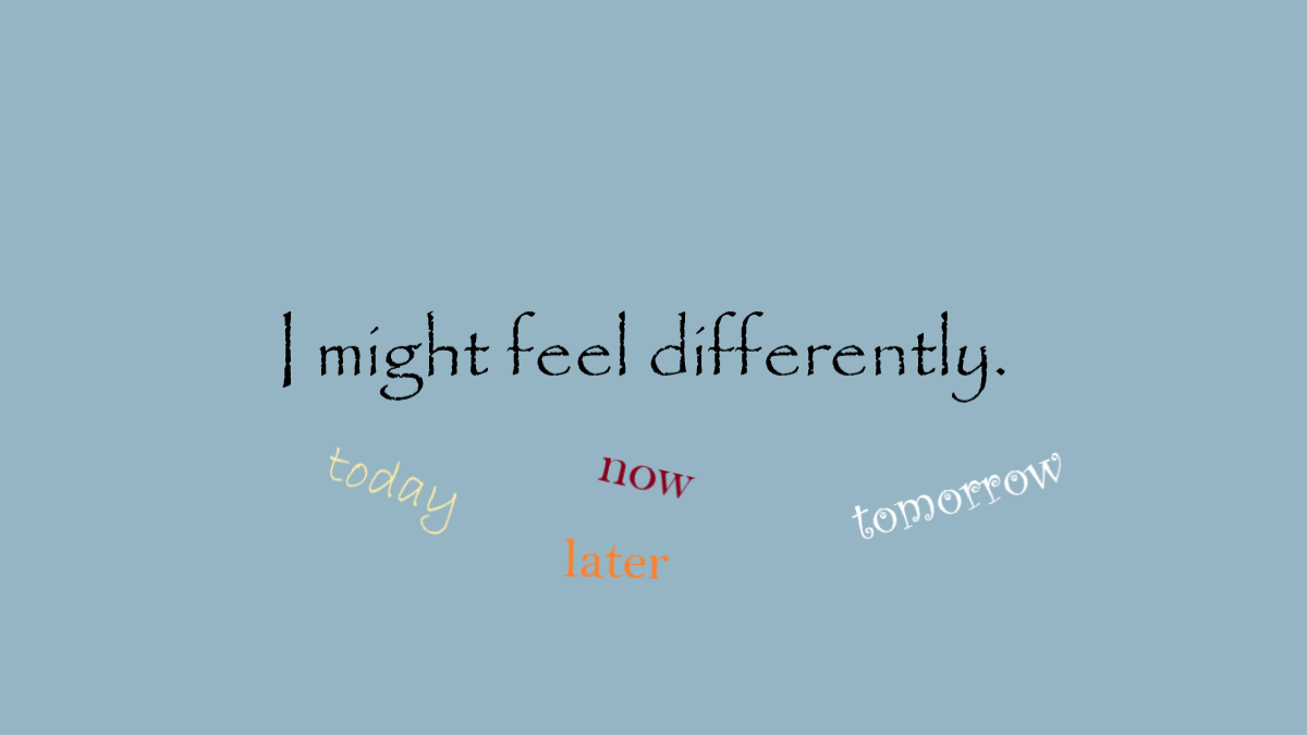 I’m not going to be the same tomorrowas I am today.I might feel differentlyabout what provokes laughter in meand I might cry over something that once brought happinessbecause each day is different and our feelings they changethey adapt. I might find wordsI’ve used are insensitiveand at other times I may not even care if theyContinue reading “I might feel differently.”